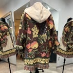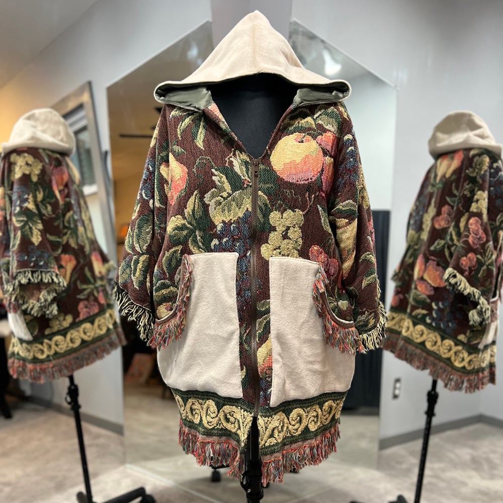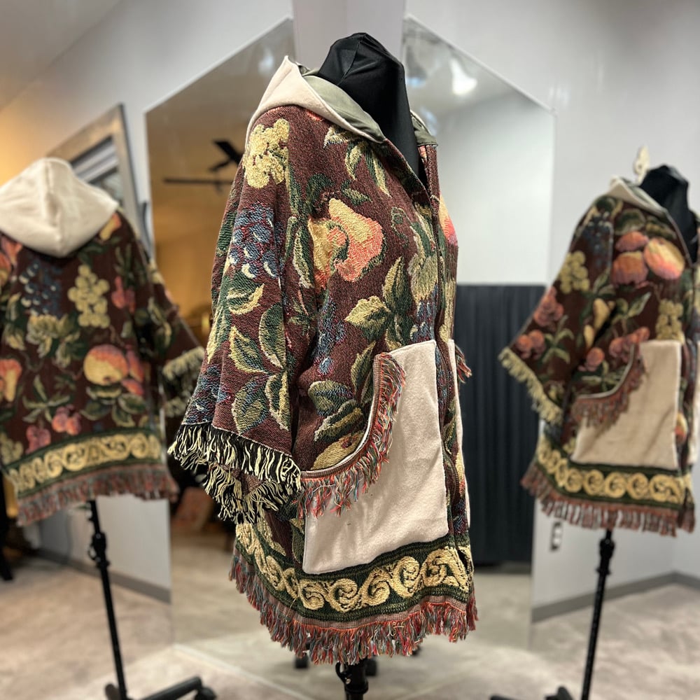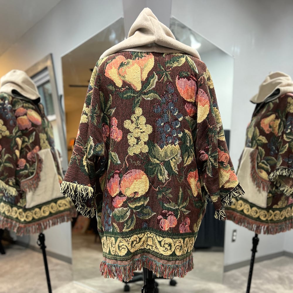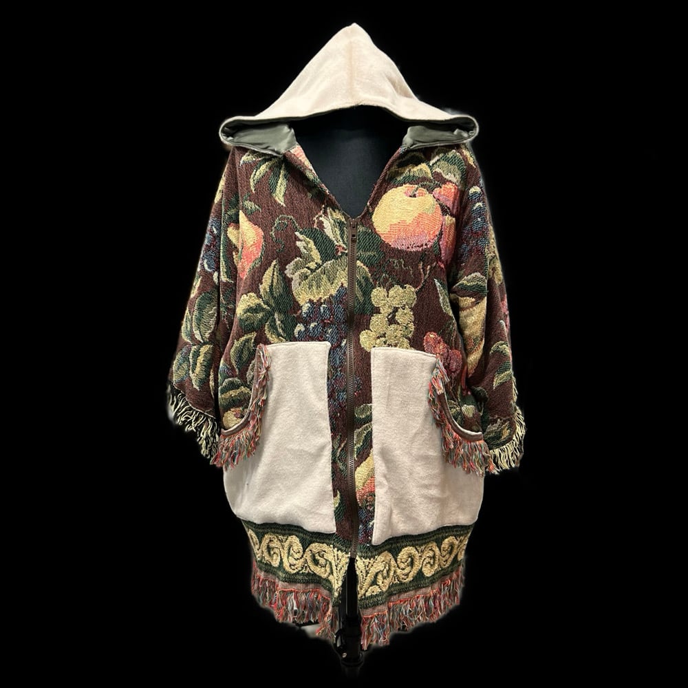 Upcycled fruit throw blanket made into a zip up hoodie with front pockets