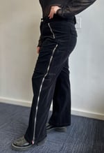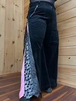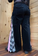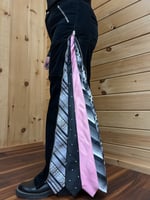 Thrifted black velvet wide leg pants upcycled with zipable black, white and pink neck ties on the sides