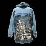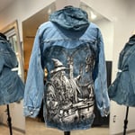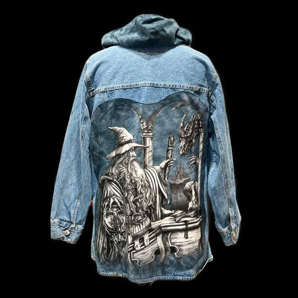 Denim jacket upcycled with wizard and dragon tee plus a hood